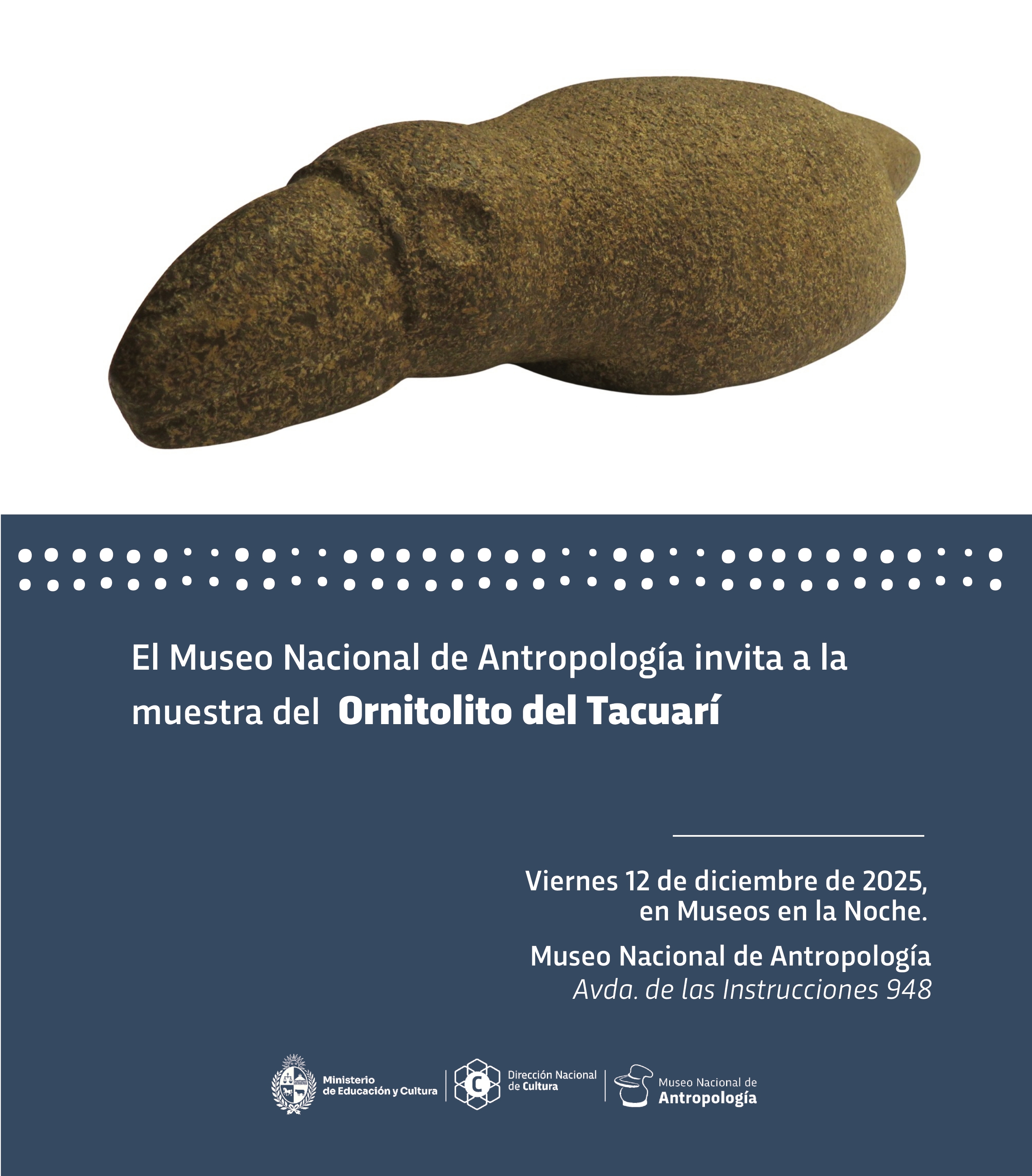 El Museo Nacional de Antropología invita a la muestra del "Ornitolito del Tacuarí", en el marco de Museos en la Noche.