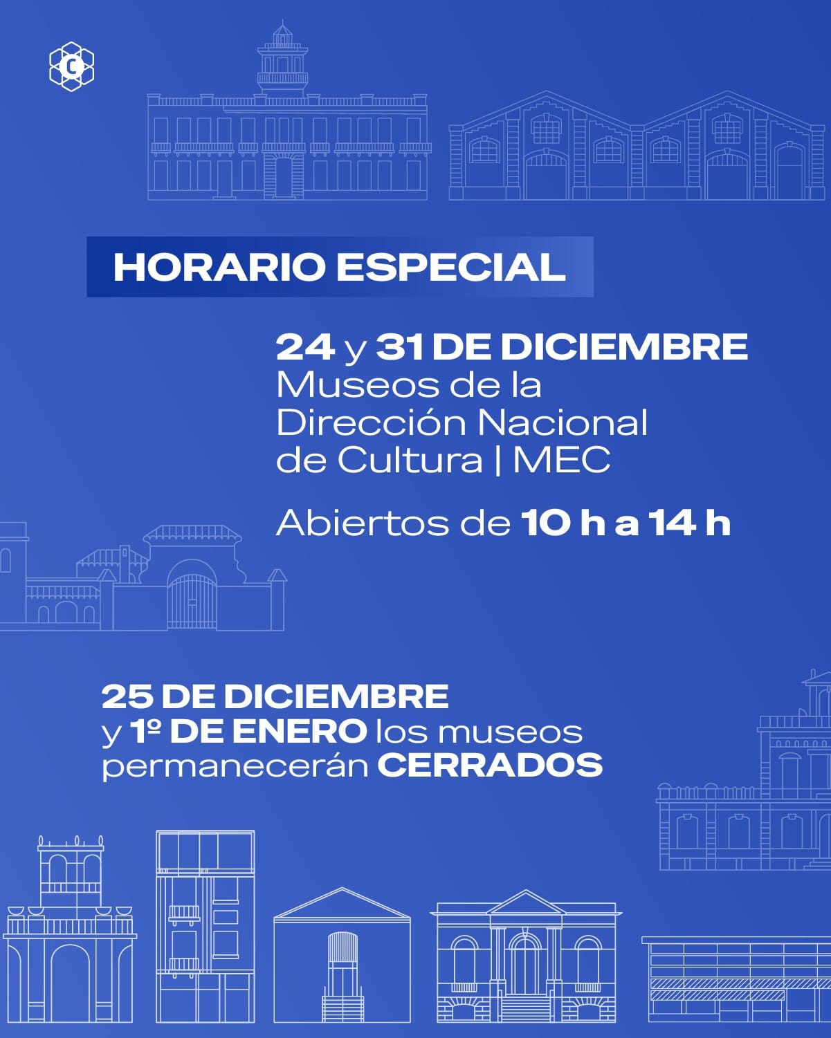 Los museos de la Dirección Nacional de Cultura tendrán horario especial, el 24 y el 31 de diciembre estarán abiertos de 10 a 14 horas. El 25 de diciembre y el 1º de enero permanecerán