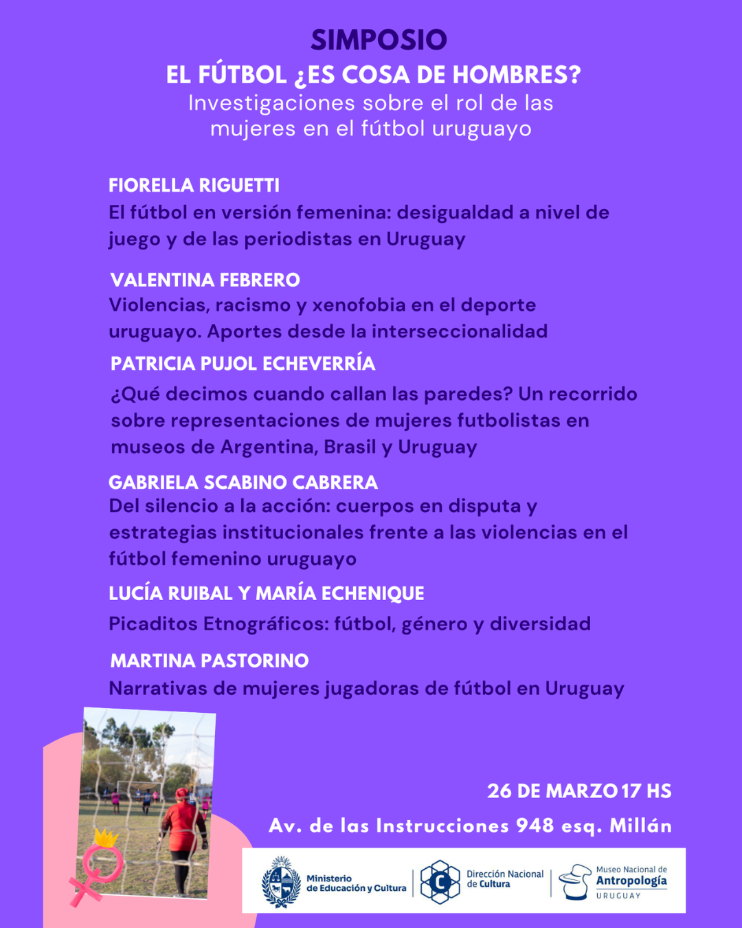 Conferencias acerca de investigaciones sobre el rol de las mujeres en el fútbol uruguayo.