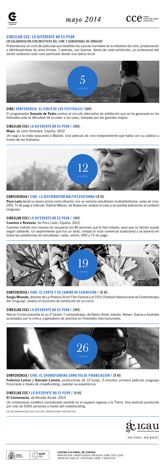 Cineclub CCE “Lo diferente no es peor”, se desarrollará en colaboración entre el CCE y el ICAU durante todos los lunes del mes de Mayo entre las 18 y las 20.30hs. En esta ocasión, el hilo conductor del ciclo es la producción y/o distribución alternativa, y para ello contaremos con cuatro películas que rompieron moldes.